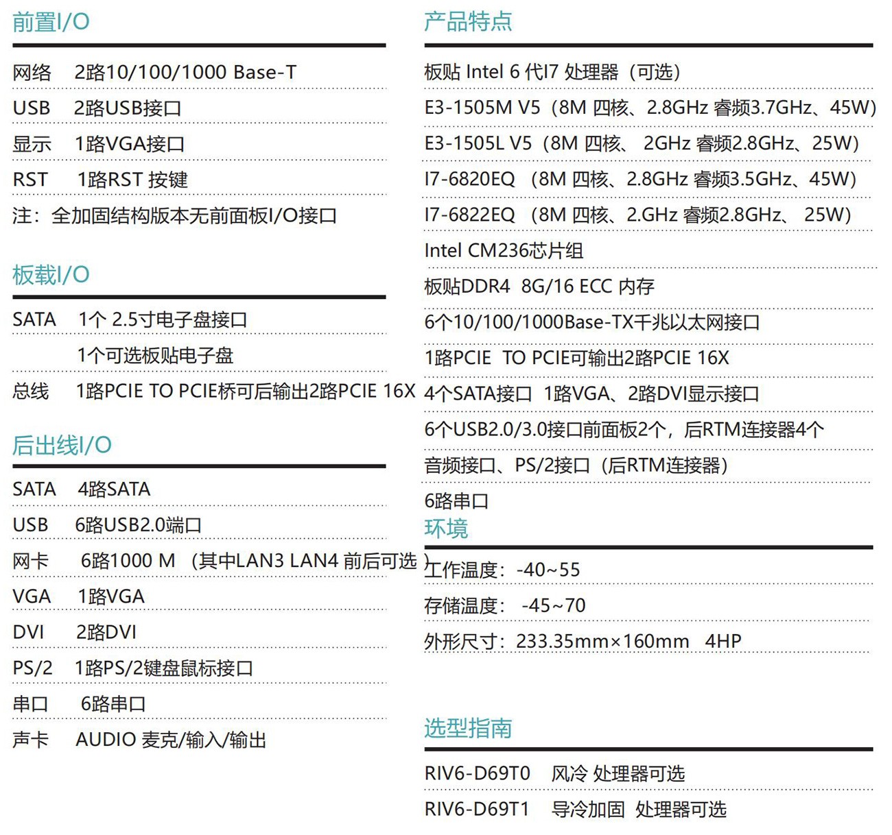 面板2路USB2.0及1路VGA,2路網(wǎng)絡(luò)接口; 備選板載SSD 64G;后IO接口: 后出2路16xPCIE;4路1000Base-T;1路10G網(wǎng)絡(luò);6路 USB;6路 RS422/485S可 選 串 口 ; 1路 Audio;1路 KB/MS PS2;2路DVI;1路VGA;4路SATA;板上有BMC健康管理系統(tǒng) 可以偵測(cè)試溫度及主板工作狀態(tài), 設(shè)計(jì)了高效的散熱系統(tǒng),可顯著提高處理器的浮點(diǎn)運(yùn)算性能,以太網(wǎng)、PCIe、支持高帶寬數(shù)據(jù)傳輸,專為惡劣環(huán)境使用而設(shè)計(jì),滿足無(wú)人機(jī)、裝甲車、水面艦艇等軍工領(lǐng)域。