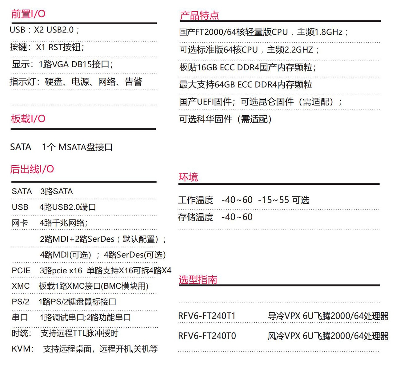 采用國產(chǎn)飛騰處理器遵從 VITA65 規(guī)范支持貼裝不同規(guī)格 FT2000/64 CPU 最大支持64GB ECC DDR4內(nèi)存4路千兆 以太網(wǎng)絡支持TTL脈沖時統(tǒng)。具備豐富的外圍接口;設計了 高效的散熱系統(tǒng),可顯著提高處理器的浮點運算性能,以 太網(wǎng)、PCIe、支持高帶寬數(shù)據(jù)傳輸,滿足視頻采集與處理、雷達和聲吶等應用對高速數(shù)據(jù)傳輸?shù)囊?。滿足無人機、雷達、水面艦艇等軍工領域。