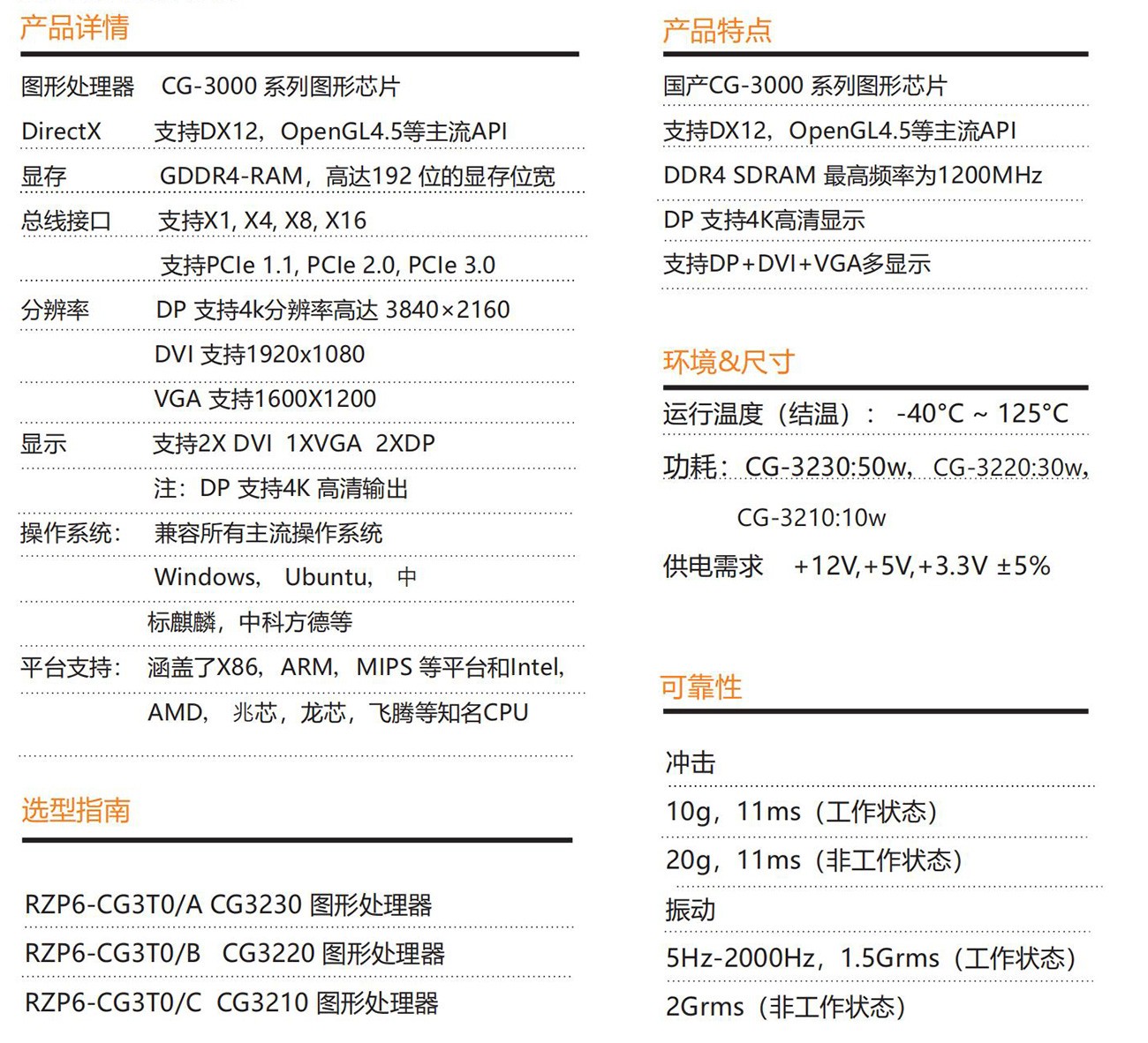 一款CPCI-E 6U 架構(gòu)獨(dú)立顯卡,采用CG-3000 系列芯片 圖形芯片, 是國(guó)內(nèi)領(lǐng)先的基于28 納米工藝的完全自主知識(shí)產(chǎn)權(quán)獨(dú)顯GPU 芯片,內(nèi)置自主 研發(fā)的新一代強(qiáng)大的圖像處理引擎,為AI 應(yīng)用做了特別優(yōu)化,完全滿足各 種日常顯示需求。具有多顯示輸出擁有很高的軟件系統(tǒng)兼容性,兼容所有 主流操作系統(tǒng),包括但不限于Windows, Ubuntu, 中標(biāo)麒麟,中科 方德等。硬件系統(tǒng)的支持也涵蓋了X86,ARM,MIPS 等平臺(tái)和Intel, AMD,兆芯,龍芯,飛騰等知名CPU 生產(chǎn)商。獨(dú)有的超低功耗設(shè)計(jì), 助力綠色辦公。所有的制程工藝和周邊器件全部可采用國(guó)內(nèi)供應(yīng)商, 確保完全自主可控,能夠應(yīng)對(duì)最復(fù)雜的并行應(yīng)用程序,比如地形繪