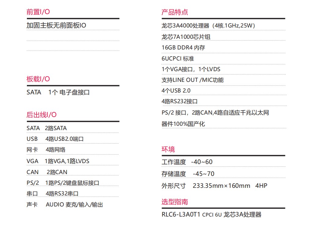 采用國產(chǎn)龍芯3A4000+7A1000處理器設(shè)計,CompactPCI 6U架 構(gòu),符合PICMG2.0 R3.0、PICMG2.16、PICMG2.3標準和海軍標 主板標準。該產(chǎn)品具備優(yōu)越的數(shù)據(jù)處理能力、圖形顯示能力、網(wǎng)絡(luò) 通訊能力、雷達和聲吶等應(yīng)用對高速數(shù)據(jù)傳輸?shù)囊?。專為惡劣環(huán) 境使用而設(shè)計,適用于對實時數(shù)據(jù)處理、通訊、自動化、軍工等領(lǐng) 域。